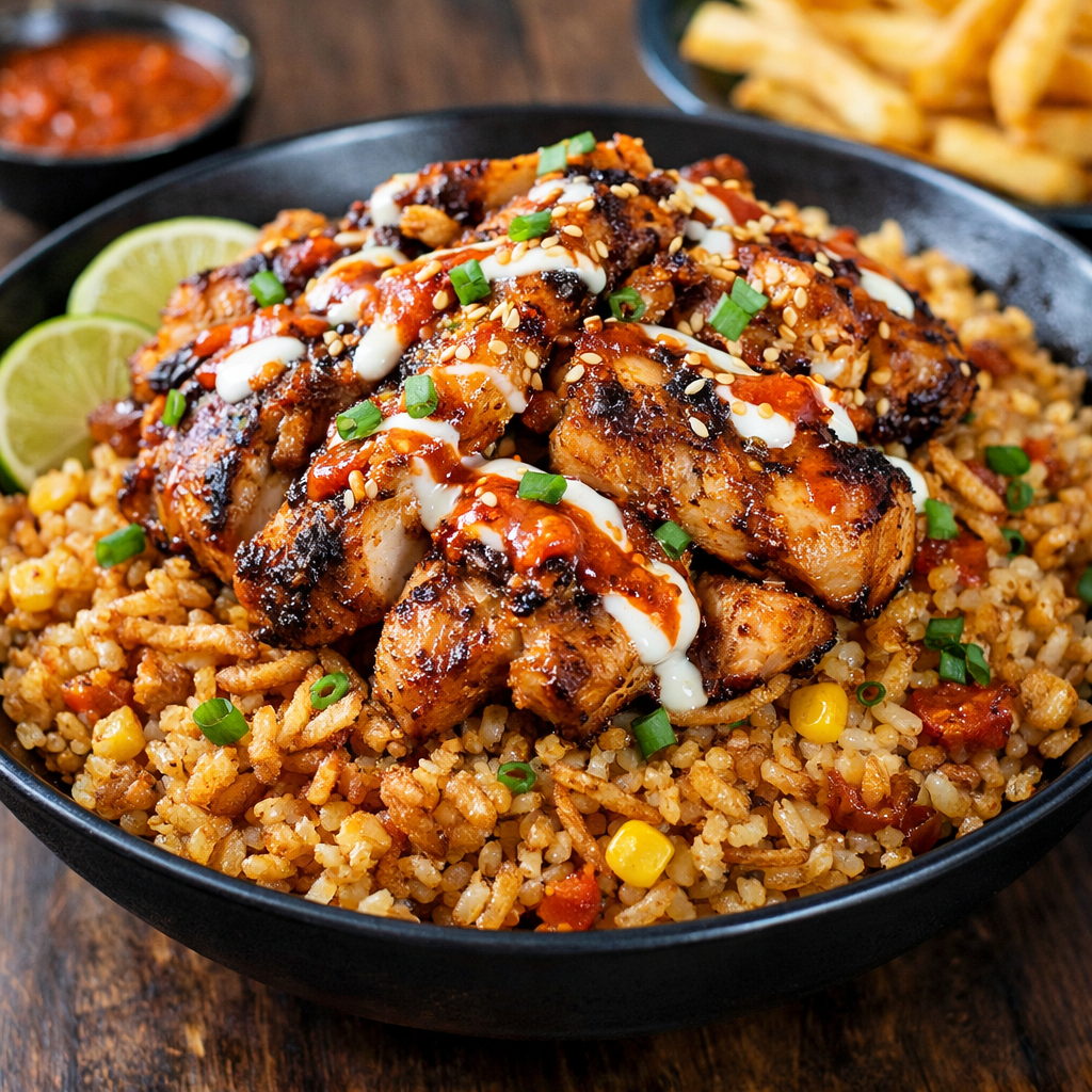 Cette création associe un riz crousty délicatement doré à un poulet mariné aux épices maison , grillé pour révéler toute son intensité. La texture légèrement croustillante du riz contraste parfaitement avec le fondant de la viande , offrant une expérience savoureuse et équilibrée.